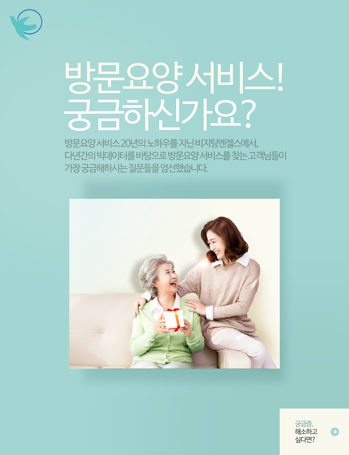 2007년부터 비지팅엔젤스가 직접 어르신들을 모셔오며 쌓아온 데이터를 AI 인공신경망으로 분석하여, 우리 부모님께 가장 필요한 서비스를 정확하게 유형별로 분류하여 제안해 드립니다.